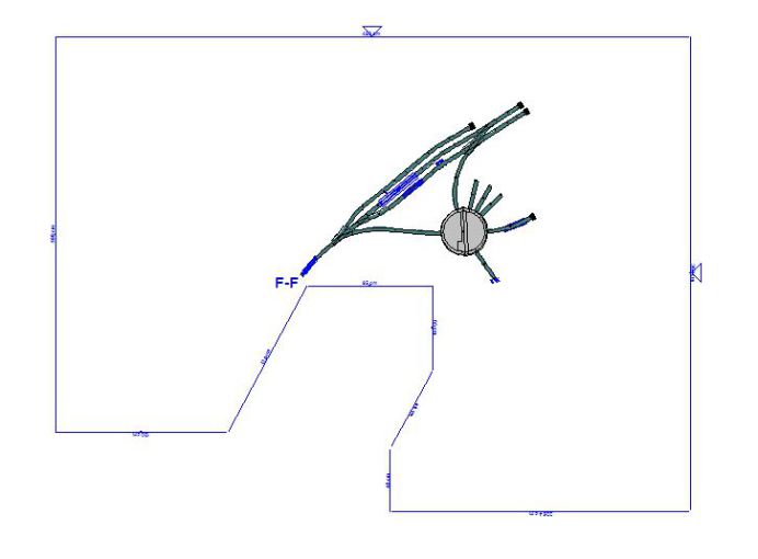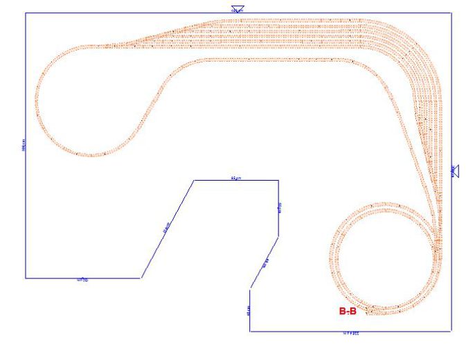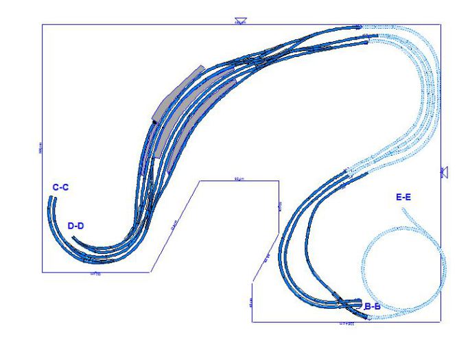 Hauptbahnhof mit weiterer Paradestrecke rechts, die 2-gleisige Hauptstrecke führt leicht fallend in die Abfahrt zum SBhf2 (B-B), die Anbindungen an die Nebenstrecke (D-D) bleibt auf dem 150er Niveau, während die rechte Nebenstrecke zur Brücke (E-E) leicht ansteigt. um über der Hauptstrecke in den Tunnel einzufahren und über einen Wendel die Brücke zu passieren.