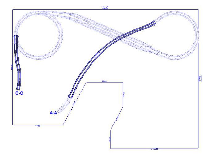 Paradestrecke aus SBhf1 kommend(A-A) auf Höhe +-0, ein Zugwechsel unter der Paradestrecke und ein Wendel auf +150mm vor der Einfahrt in den Hauptbahnhof (C-C)