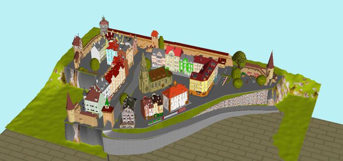 SO sieht das Gesamtkunstwerk aus. Links oben im Eck wird eine Altstadt entstehen, die den Wendel drunter versteckt, um den HBhf dann städtisches Treiben, das Bw mittig, unten an der Ecke ein Badesee, rechts Gebirge mit dem Nebenbahnhof.